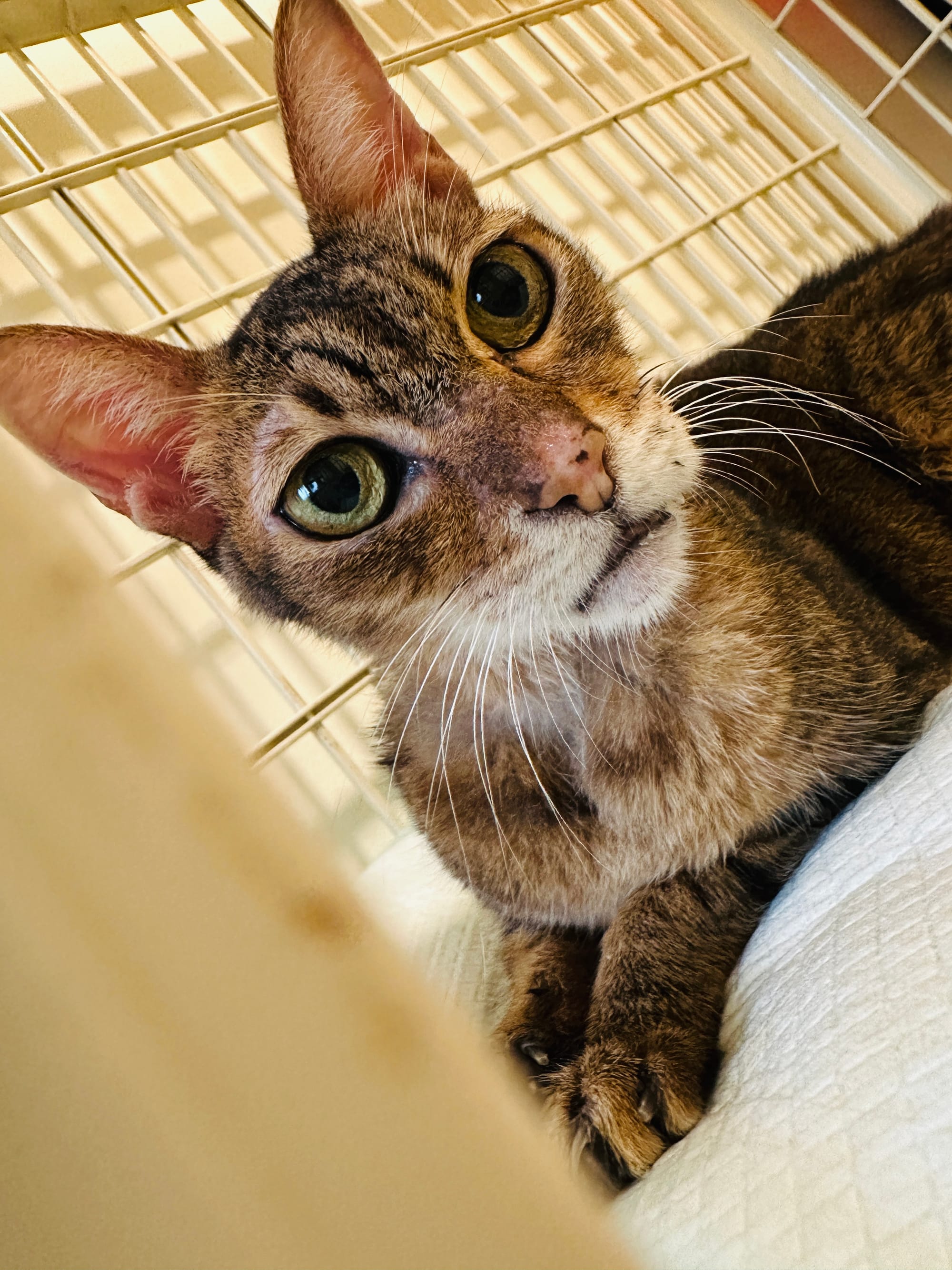 被帶回醫院後,醫生發現花咩長期便秘,肚子裡塞滿了至少兩週以上的糞便,所以導致食慾下降,身材削瘦,幸好經過緊急治療已逐漸恢復。她目前住在台中中途姊姊家,每天都有乾淨柔軟的床、安靜的空間,開始學會放鬆打呼嚕。