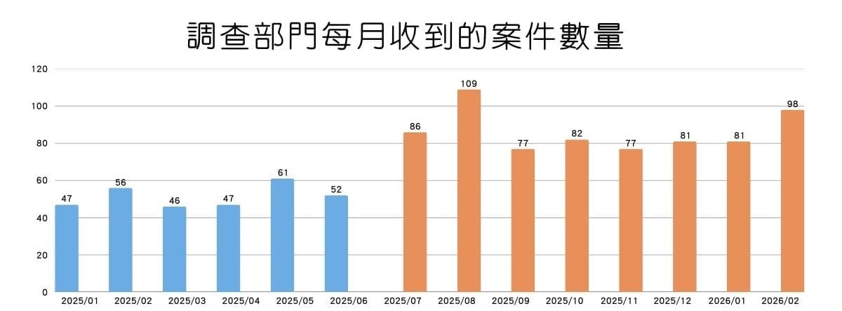 Taiwan SPCA 調查部門受理民眾通報台灣有主動物的不當飼養與虐待案件,物種包含犬貓、爬蟲鼠兔鳥...任何人為飼養的有脊椎動物物種(動保法保護的範圍),並與各縣市動物保護主管機關合作,取締違法行為。