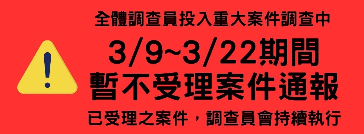 • 案件的推進需仰賴您的觀察與回報。 往來信件內容、文字或影像,未經調查員同意請勿外流; 若經發現,將停止向您提供任何後續處理資訊,以避免影響案件進展。