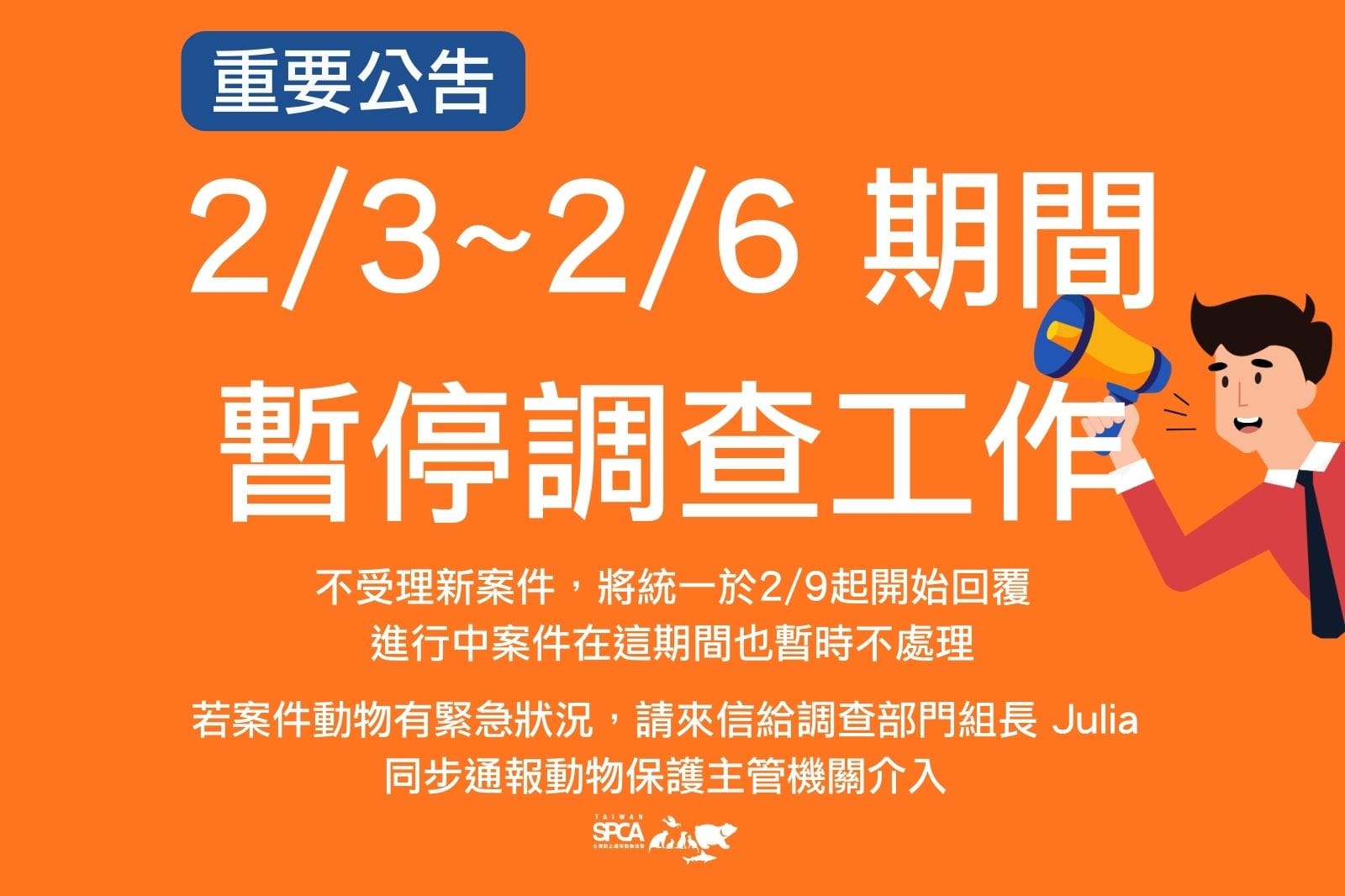 • 調查部門有既定排程,無法進行即時訪查,沒有辨識臉部能力、也沒有公權力可以調閱車牌,若動物已有危及生命之虞(正在發生、受傷、受困、單獨關在車裡...),而您無法自行提供協助,請優先通報當地動物保護主管機關,或撥打 1959。